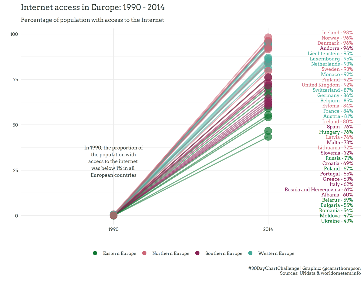 Back to the Internet access data from #UNData for a simple graph exploring how things have changed since 1990 in Europe.