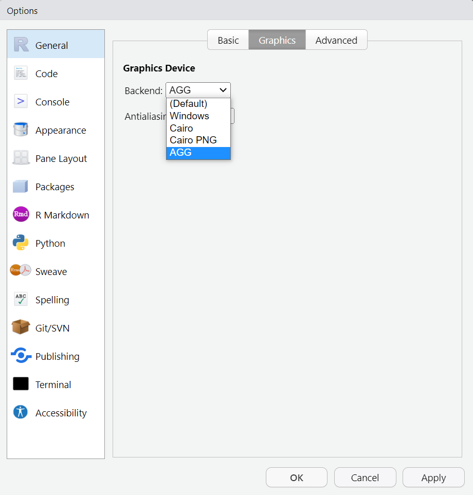 In your Global options, navigate to your graphics options, and set the graphics device to AGG using the dropdown menu.