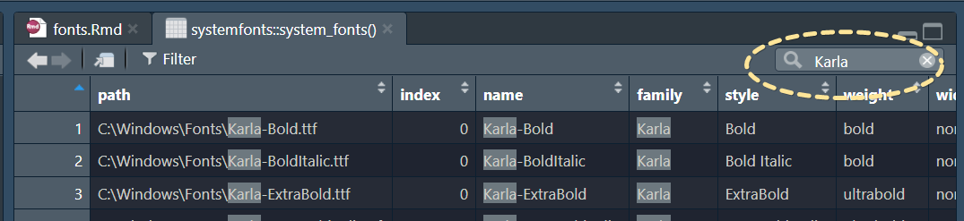 systemfonts::system_fonts() |> View()This should bring up a dataframe for you to look at. Use the search bar to look for your font (in this case, we’re looking for “Karla”).