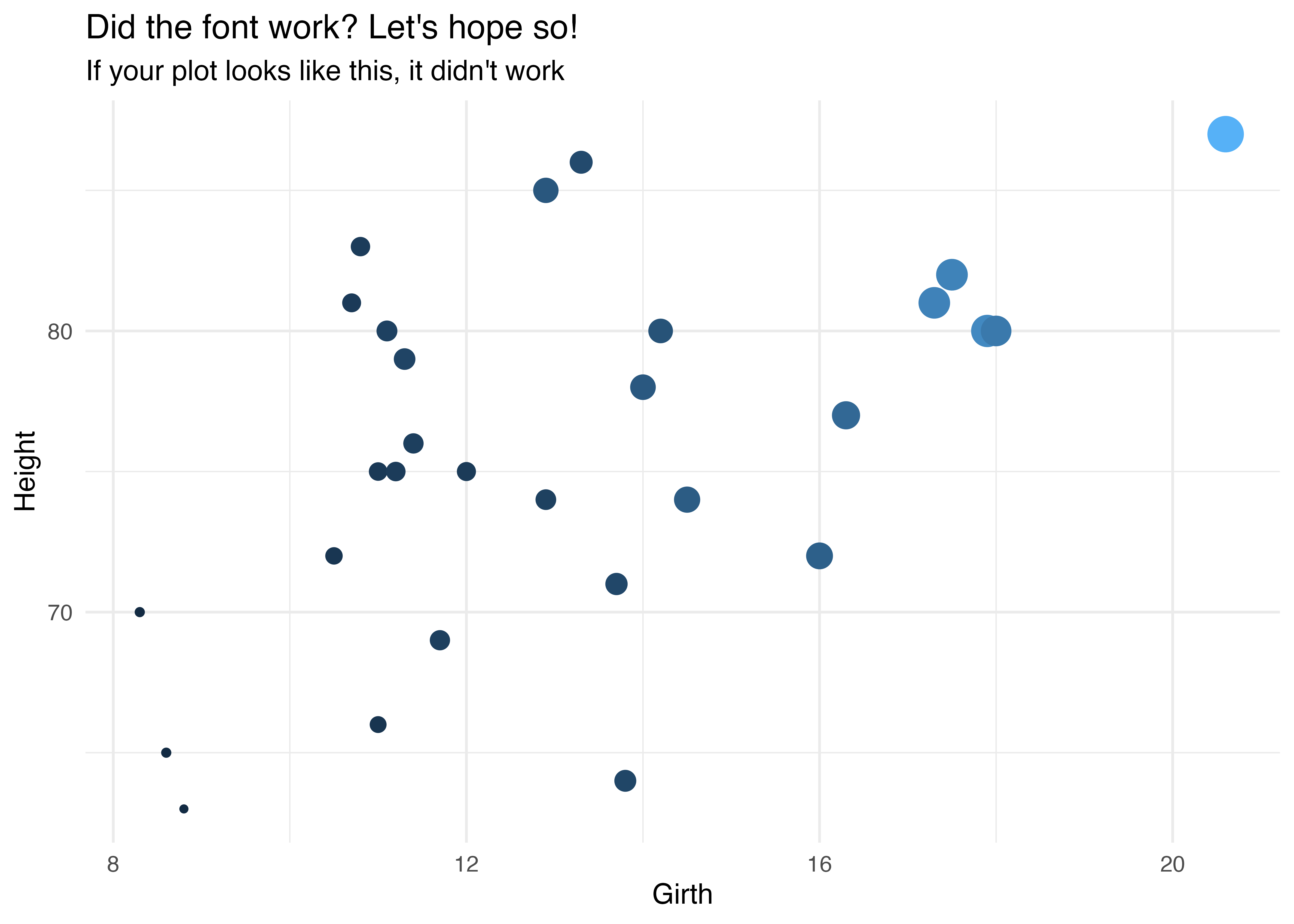 I’m also grateful for the patience and perseverance of David Keyes and the band of merry consultants at R for the Rest of Us for all the troubleshooting we have done over the years to get fonts to work across different devices for different client projects. David’s upcoming book “R Without Statistics” is sure to be a great resource!